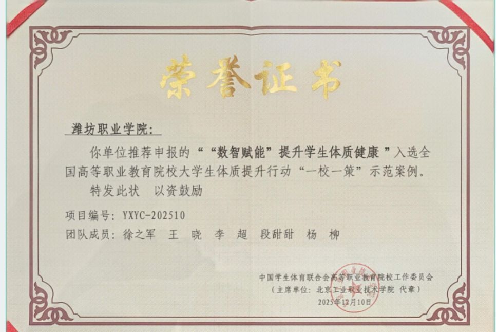 近日,中国学生体育联合会高等职业教育院校工作委员会公布结果,我院申报的《“数智赋能”提升学生体质健康》项目成功入选全国高等职业教育院校大学生体质提升行动“一校一策”示范案例,成为全国28所获此殊荣的高职院校之一,充分彰显了学院在体育育人改革领域的示范引领价值。本次遴选以贯彻落实全国教育大会精神为核心,紧扣《教育强国建设规划纲要(2024—2035 年)》《关于加强和改进新时代学校体育工作的意见》等文件要求,旨在推动高职院校体育工作高质量发展,...更多