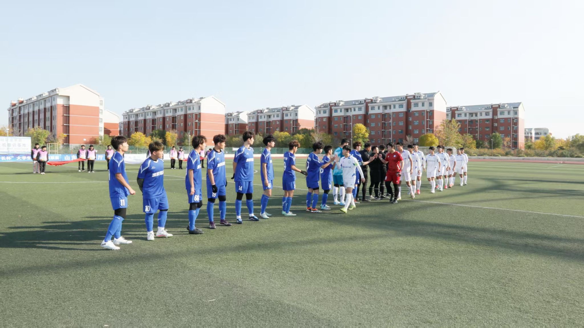 11月3日,备受瞩目的山东省首届“省长杯”大学生足球超级联赛潍坊赛区比赛在我院鸣哨开赛。学院院长韩瑞东,党委委员、副院长赵宏坤出席,韩瑞东开出首球,为这场盛大的校园足球盛会按下了“启动键”。
